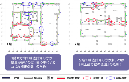 尚、検証結果において建築基準法における存在壁量と品確法の耐震等級1における壁量計算の存在壁量には差異が見られます。これは必要壁量算定において、住宅性能表示制度における壁量計算用床面積は、建築基準法に規定された床面積に、1 階では2 階のオーバーハング面積と玄関ポーチ面積、バルコニー面積の40%を、2 階では吹抜け面積を加えた値となる為です。