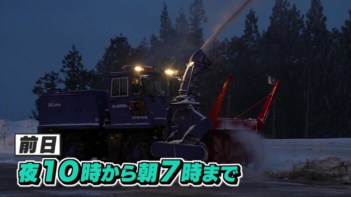 約3400台分の広大な駐車場を除雪するため、作業は前夜から朝7時まで実に9時間にも及ぶ。