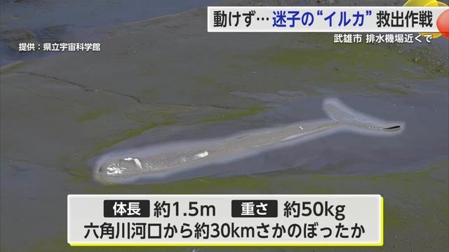 スナメリの体長は約1.5m、体重約50kg。有明海に注ぐ六角川の河口から約30km上流までさかのぼってきたものとみられている。