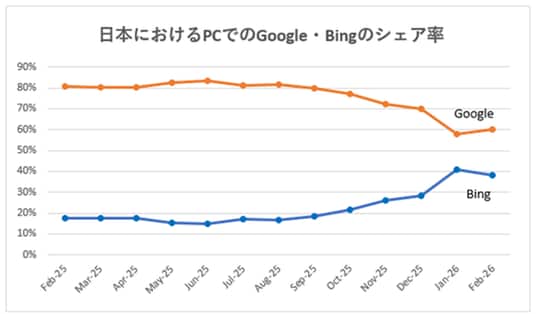日本における検索エンジンシェアは、PC検索においてGoogleのシェア率が前回調査(2025年4月)時点と比較して20%以上減少する結果となりました。一方で、BingのPCシェア率は同期間で20%以上上昇しており、日本のPC検索市場では構造的な変化が進んでいることが明らかになりました。