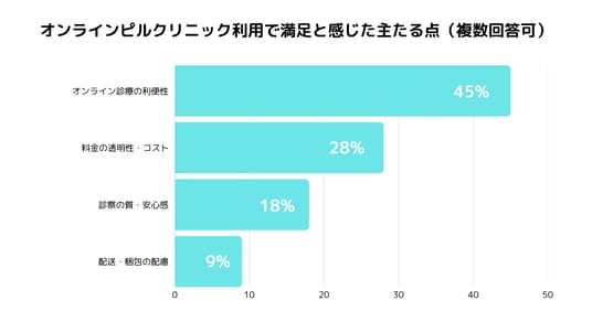 - オンライン診療の利便性(45%): 通院負担の解消、待ち時間の消失、即日発送に対する高い評価。