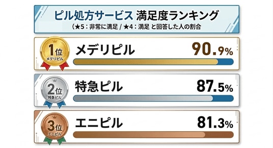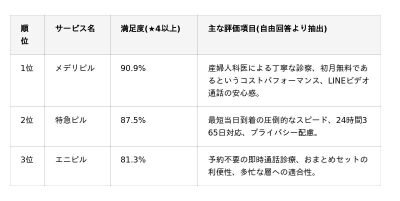 本調査では、1位のメデリピルにおいて「非常に満足」と回答した層が多く、特に初めてピルを服用する層からの「医師の顔が見える安心感」が評価を押し上げています。