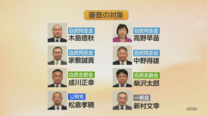 これを受けて設置された政治倫理審査会は、審査の対象となっている8人の市議と議長を除いた7人の委員で構成されていて、場合によっては、対象の市議に警告や辞職勧告などをすることができます。