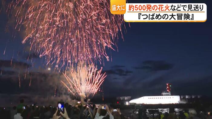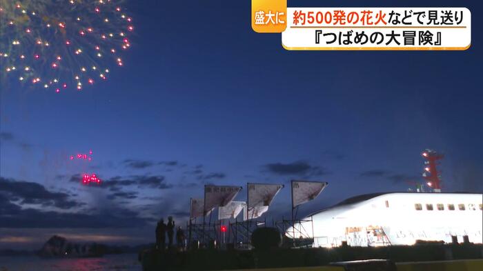 夕方には出港セレモニーが開かれ、地元の高校生たちが和太鼓や吹奏楽の演奏で花を添えました。そして午後7時、新八代駅の大磯啓介駅長の合図で『つばめ』が出航。音楽に合わせて打ち上げられたおよそ500発の花火が、沖に向かって進む『つばめ』の車体を色鮮やかに照らしていました。