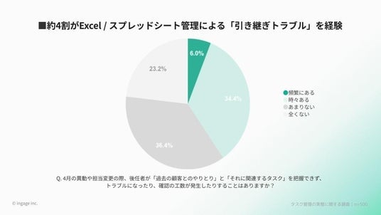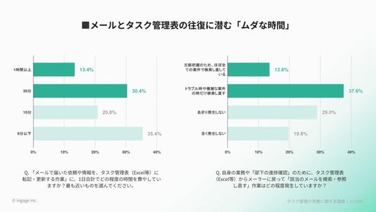 コミュニケーションプラットフォ-ム「Re:lation(リレーション)」を提供し、6,000社以上(※1)の導入実績を誇る株式会社インゲージ(本社:大阪府大阪市、代表取締役社長:和田 哲也)は、日常的にメールとタスク管理表(Excel / スプレッドシート等)を併用しているビジネスパーソン500名を対象に、「タスク管理の実態に関する調査」を実施いたしました。
