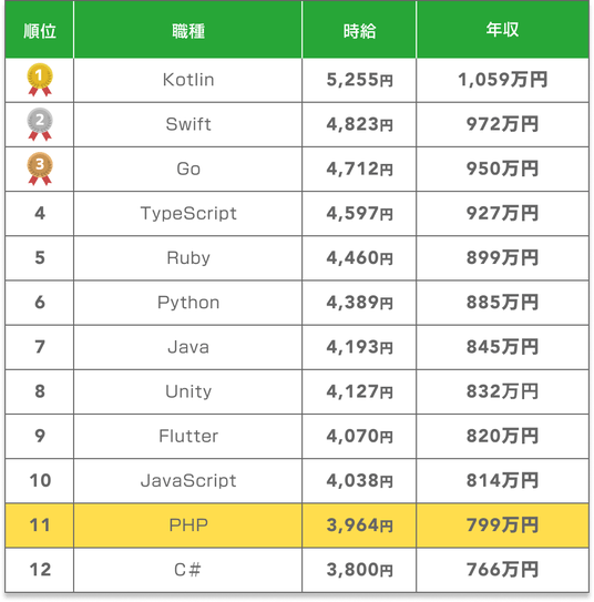 SOKUDANに掲載されているPHP案件の平均年収は799万円です。職種別年収ランキングでは12位中11位ですが、一般的なエンジニアの年収水準と比較すると高い報酬といえます。