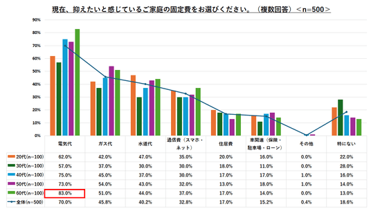 現在抑えたい固定費を聞いたところ、第1位は「電気代(70.0%)」となり、次点のガス代(45.8%)を大きく引き離しました。電気代への強い不安があることがうかがえます。特に60代は83.0%が電気代を削減したいと考えており、意識が高いことがわかりました。