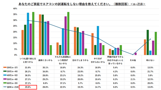試運転をしない、と回答した人にその理由を尋ねたところ、全体では「いつも通り使えると思うから(29.8%)」が最多となり、40代では36.5%が回答しています。次いで「面倒くさいから(28.0%)」が続きました。