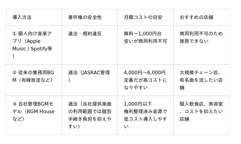 ■ 店舗BGMサービス 3つの導入方法の比較表