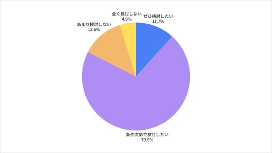 ぜひ検討したい(23.3%) / 条件次第で検討したい(59.2%) / あまり検討しない(14.6%) / 全く検討しない(2.9%)