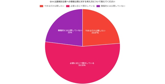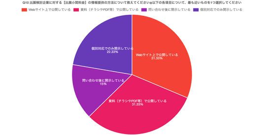 出展検討に必要な情報については、「Webサイトで公開」「資料で一般公開」といった形式での提供が6割近く見られる一方で、「問い合わせ後に開示」「必要に応じて個別に開示」といった回答も少なくなく、情報提供の方法には多様なやり方で運用されていることが明らかになった。