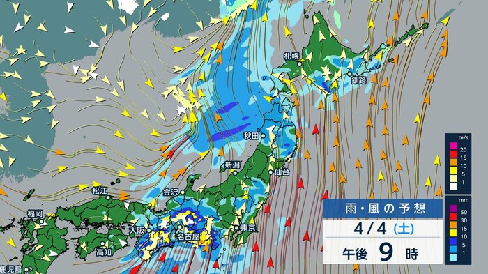 桜にとっては試練の風雨で、満開になった桜は花散らしとなりそうだ。荒れ模様は5日(日)の午前中まで残る可能性があり、今後の最新気象情報に注意してほしい。