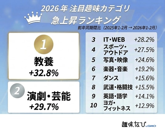 GMOインターネットグループのGMO趣味なび株式会社(※1)(代表取締役社長:伊東 祐輔 以下、GMO趣味なび)は、4月3日の「趣味の日」に合わせて、趣味と学びの「体験」&「教室」さがしのプラットフォーム「趣味なび byGMO」における2026年1~2月の閲覧データを、前年同期(2025年1~2月)と比較した、「注目の趣味カテゴリ 急上昇ランキング」を発表いたします。