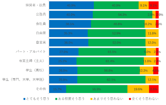 2、青切符適用を知ってから、自転車の交通安全に対する意識が高まった人は85%「青切符適用を知ってから、自転車の交通安全に対する意識が高まりましたか?」に対し、「とてもそう思う」30.2%、「ある程度そう思う」55.1%で、安全意識が高まった人が85.3%にのぼりました。職業別では、「とてもそう思う」と回答した割合が最も高かったのは経営者・役員(40.9%)、次いで公務員(40%)でした。