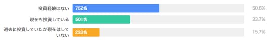 暗号資産(仮想通貨)への投資経験を問うと、「投資経験はない」が最多の50.6%(752名)。現在も投資している層は33.7%(501名)にとどまり、過去に投資していたが現在はやめているという層も15.7%(233名)存在します。