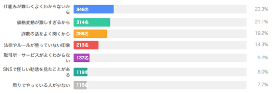 最多は「仕組みが難しくてよくわからないから」の23.3%(346名)で、「価格変動が激しすぎる」21.1%(314名)、「詐欺の話をよく聞くから」19.2%(286名)が続きます。