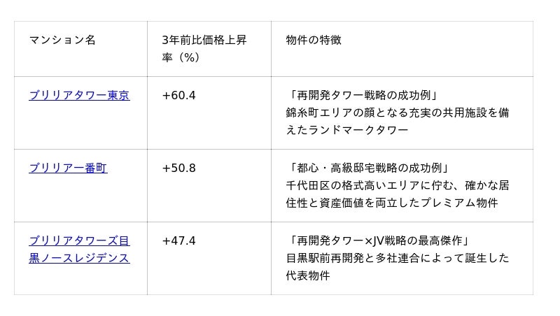 表3:代表物件別の価格上昇率と特徴(2026年3月マンションナビ調べ)
