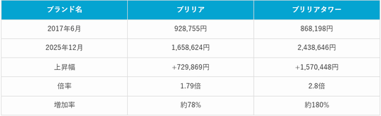 表1:2017年6月と2025年12月比較ブリリアとブリリアタワー平均価格(2026年3月マンションナビ調べ)※金額の単位は「円/平方メートル 」