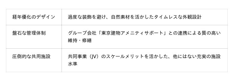東京建物は1896年に安田財閥の創始者・安田善次郎によって設立された日本最古の総合デベロッパーです。「洗練と安心」をブランド理念とし、特定の層に限定されず都市型ライフスタイルに適応する品質と立地を両立しています。さらに、ブリリアの大きな強みの一つが、大手デベロッパーとの共同事業(JV)戦略です。各社の高い基準が統合されることで、品質・立地・管理において隙のない物件が誕生し、中古市場においても高い信頼性とリセールバリューの優位性を確立しています。