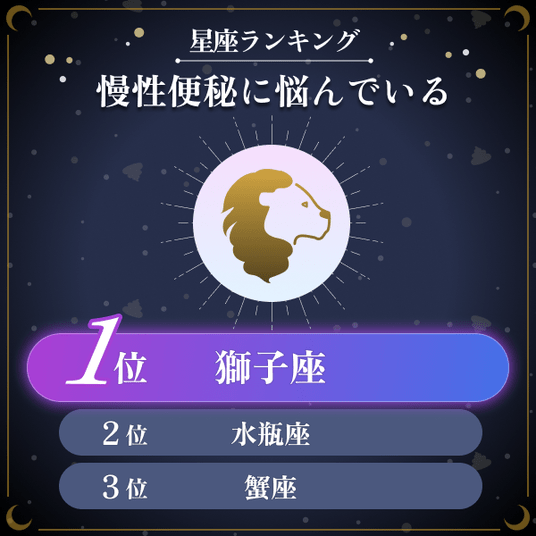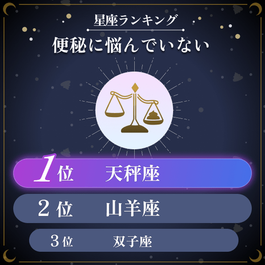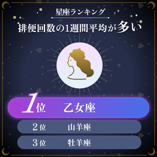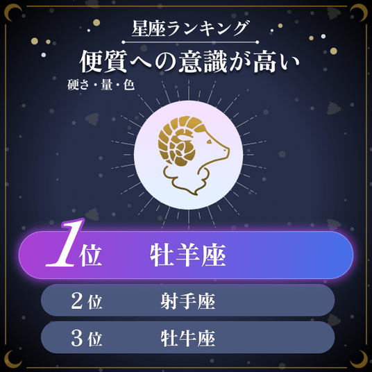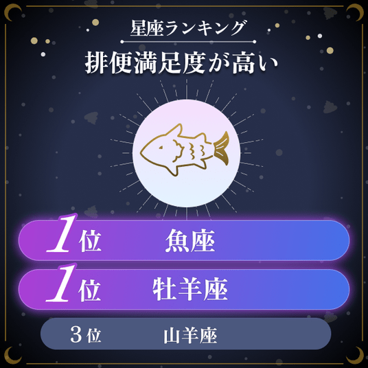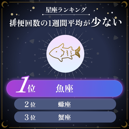 ・全12星座に対して、排便時のスッキリ感を評価する「排便満足度」を聞いたところ、最も高い星座は「魚座」と「牡羊座」が同率の1位で、次いで3位は山羊座であることがわかった。