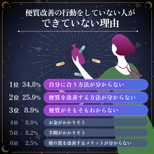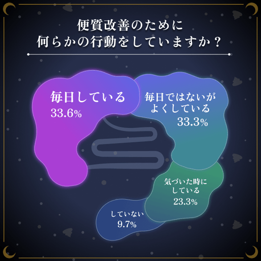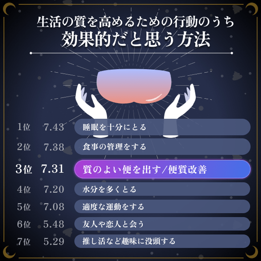 また、排便回数が少ない魚座が満足度で第1位となるなど、単なる回数(出るか出ないか)よりも「満足感のある便質」がスッキリ感の方が直結している実態も明らかになりました。一方で、便質改善の重要性は理解しつつも、実際に毎日行動できている人は約3割に留まっており、自分に合う方法が分からないという課題も浮き彫りになっています。