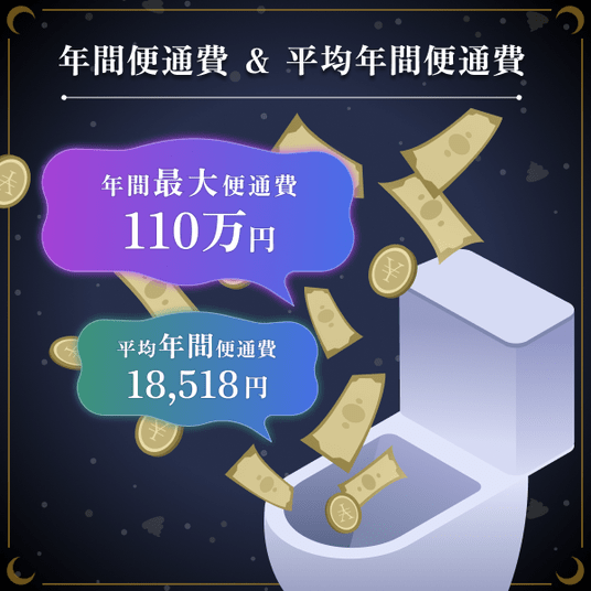 ・便秘に悩む人に対して、便通費(便通改善のために年間で費やすお金)を聞いたところ、最大はなんと110万円に達し、前回より10万円も多く費やしている人がいることがわかった。