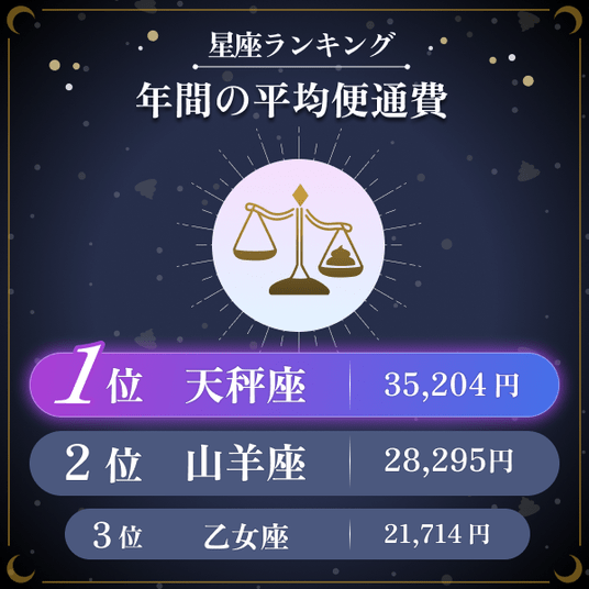 ・星座別では天秤座が平均35,204円と最も多く、同星座は「便秘の悩みが少ない星座」1位でもあった。また便通費2位の星座である山羊座も同じく、「便秘の悩みが少ない星座」2位となっており、便秘対策費の多さと悩みの少なさに相関がある可能性が示唆された。