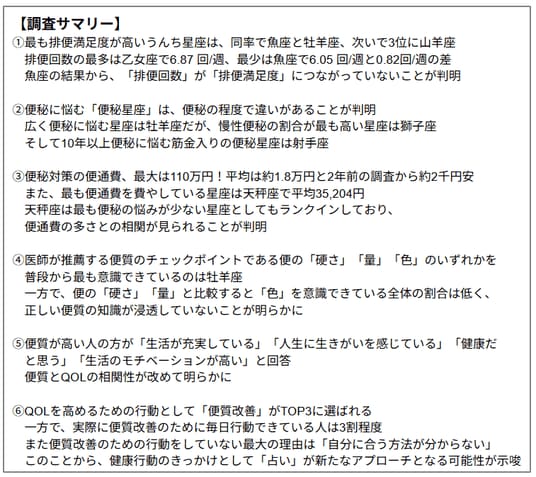 本調査はおうちの診療所中野院長であり、日本うんこ学会会長を務める元消化器外科医である石井洋介医師に監修をいただき、日本で最大のユーザー数を誇る腸活アプリ『ウンログ』と共同で実施いたしました。また、占星術で様々なメディアで活躍されているSUGAR氏から結果を踏まえてコメントを寄せていただいています。