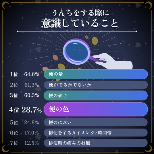 ・一方で、全体としては便の「量」(64.6%)「硬さ」(60.3%)に比べて「色」を意識している割合は、わずか28.7%と低く、便質に関して正しい知識が十分に浸透していない現状が浮き彫りになった。