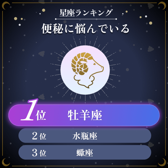 ・便秘に悩む人の割合が最も高かった星座は牡羊座で73.4%であった。次いで水瓶座が71.7%、さそり座が70.6%と続く結果となった。