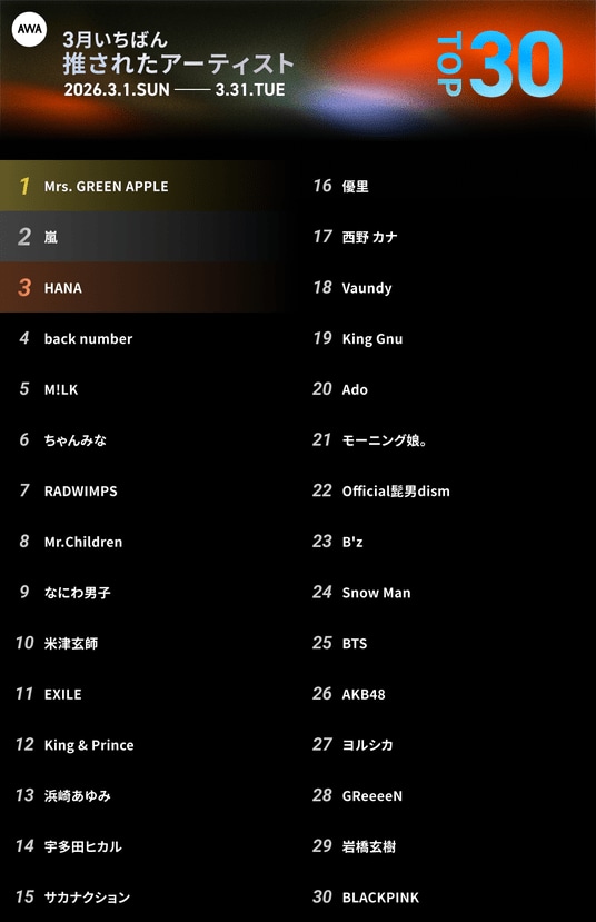 (2026.3.1~2026.3.31の期間において、AWAご利用ユーザーが作成したプレイリストに追加された楽曲のアーティストTOP30)