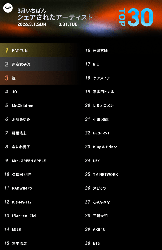 (2026.3.1~2026.3.31の期間において、AWAご利用ユーザーがシェアした楽曲のアーティストTOP30)