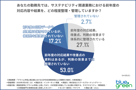 そこで、「サステナビリティ関連業務における前年度の対応内容や結果を、どの程度整理・管理しているか」を尋ねたところ、以下のような回答になりました。