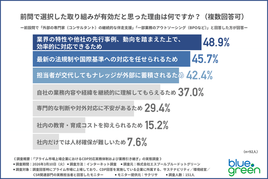 最後に、前問で『外部の専門家(コンサルタント)の継続的な伴走支援』『一部業務のアウトソーシング(BPOなど)』と回答した方に、「前問で選択した取り組みが有効だと思った理由」を尋ねたところ、『業界の特性や他社の先行事例、動向を踏まえた上で、効率的に対応できるため(48.9%)』と回答した方が最も多く、『最新の法規制や国際基準への対応を任せられるため(45.7%)』『担当者が交代してもナレッジが外部に蓄積されるため(42.4%)』と続きました。