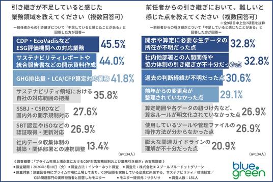 株式会社エスプールブルードットグリーン(本社:東京都千代田区、取締役社長:八林 公平、以下「エスプールブルードットグリーン」)は、プライム市場上場企業のサステナビリティ/環境経営/CSR関連部門の実務担当者を対象に、「サステナビリティ業務引き継ぎ」の実態調査を行いました。