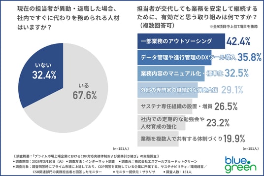 そこで今回、エスプールブルードットグリーン(https://www.bluedotgreen.co.jp/)は、プライム市場上場企業のサステナビリティ/環境経営/CSR関連部門の実務担当者を対象に、「サステナビリティ業務引き継ぎ」の実態調査を行いました。