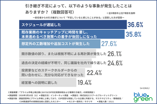 引き継ぎが不足していた業務領域は『CDPなど、ESG評価機関への対応業務』。スケジュール遅延や追加コストも・・・