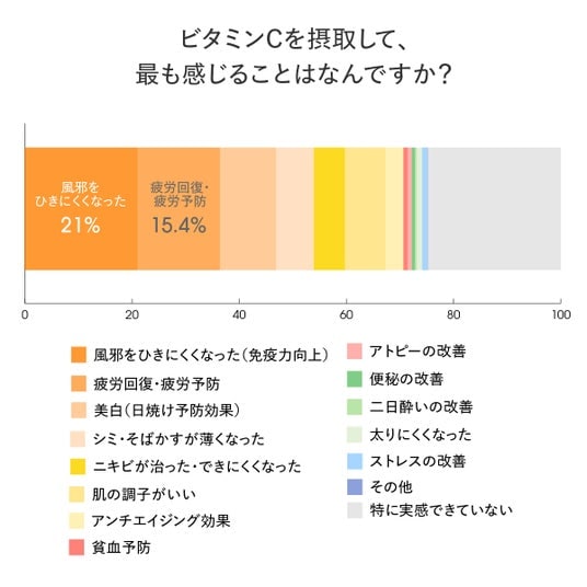 体感の中心は「免疫」「疲労」。多様な変化が実感されているビタミンCを摂取して最も感じることとして多かったのは「風邪をひきにくくなった(21.0%)」、次いで「疲労回復・疲労予防(15.4%)」が挙げられました。このほか、「美白(日焼け予防)」「シミ・そばかすの変化」「ニキビ」「肌の調子」など、肌に関する実感も複数項目に分かれて一定数見られ、体感は一部の効果に集中するのではなく、幅広く分散していることが分かります。