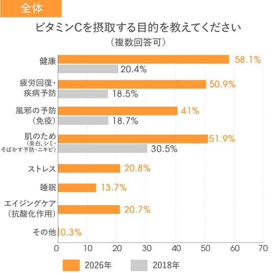 ビタミンC摂取目的、8年で変化。「美容」だけでなく「健康・疲労・免疫」へ広がるビタミンCを摂取する目的について、2018年調査では「美白」「シミ・そばかす対策」など、肌を中心とした美容目的が最上位でした。一方、2026年調査では、「健康維持(58.1%)」「疲労回復・疾病予防(50.9%)」「風邪予防(免疫)(41.0%)」がいずれも高い割合を示し、肌目的(51.9%)と並んで上位に位置しています。