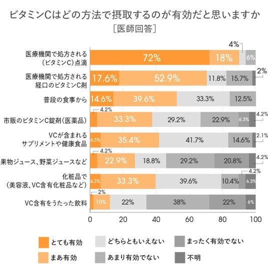 医師が有効と考えるビタミンCの摂取方法。「摂取」より「体内利用」が有効性の分かれ目「ビタミンCはどの方法で摂取するのが有効だと思うか」という設問に対し、医師の評価が最も高かったのは「医療機関で処方されるビタミンC点滴」で、「とても有効」「まあ有効」と回答した割合は9割にのぼりました。次いで、「医師が処方する経口ビタミンC製剤」も約7割が有効と評価されています。