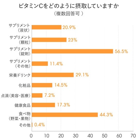 一方で、「食べ物(野菜・果物)(44.3%)」や「栄養ドリンク(29.1%)」も高い割合を占めており、ビタミンCは食事とサプリメントを軸に、さまざまな方法で取り入れられている実態がうかがえます。