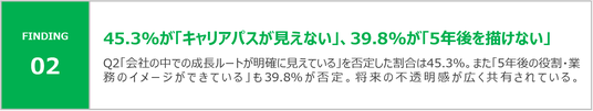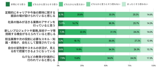 - 「自身の現在のスキルレベルが分かる」は肯定40.4%と相対的に高いが、「会社の中での成長ルート(キャリアパス)が明確に見えている」は否定が45.3%と突出して高い