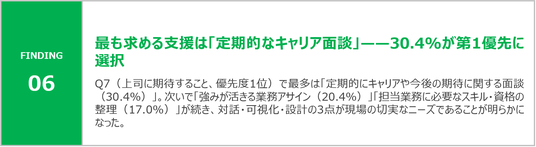 - 1位期待:定期的なキャリア・期待に関する面談(30.4%) → Q6の実施実感との乖離が最も大きい施策