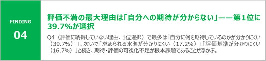 - 「求められる水準が分かりにくい」「評価基準・理由が分かりにくい」が続き、評価の透明性・言語化の欠如が共通課題として浮かび上がる