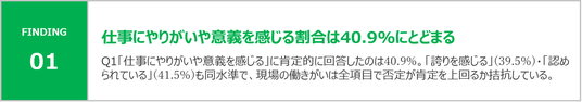 - 「やりがいや意義を感じる」肯定層は約41%に達する一方、「仕事ぶりや努力が認められている」の否定層は約26%存在し、貢献実感と承認実感の間にギャップがある