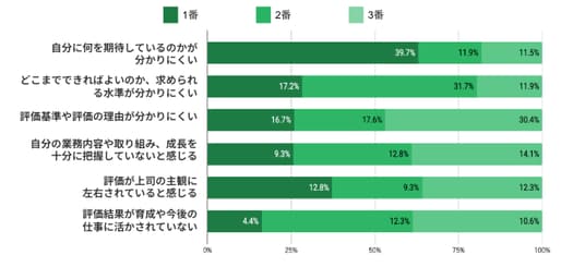 - 「評価が上司の主観に左右されている」も1位選択12.8%に上り、評価の属人性への不信感も顕在化