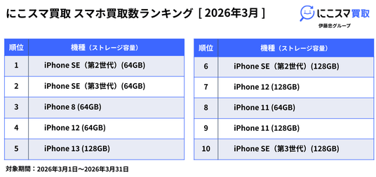 2026年3月の販売数ランキングでは、「新生活応援セール(2026年3月16日~3月31日)」の影響もあり全体的に取引数が増加するなか、iPhone SE(第3世代)(64GB)が10か月連続で1位にランクインしました。