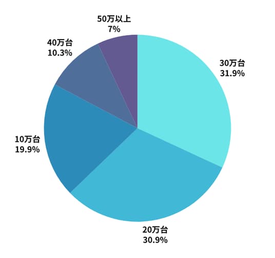 2026年3月の価格帯別動向では、30万円台(32%)が最多となり、20万円台(30.8%)が僅差で続く結果となりました。これまで首位だった20万円台に対し、30万円台の存在感がさらに高まっており、ユーザーの関心がやや上の価格帯へシフトしたことが読み取れます。