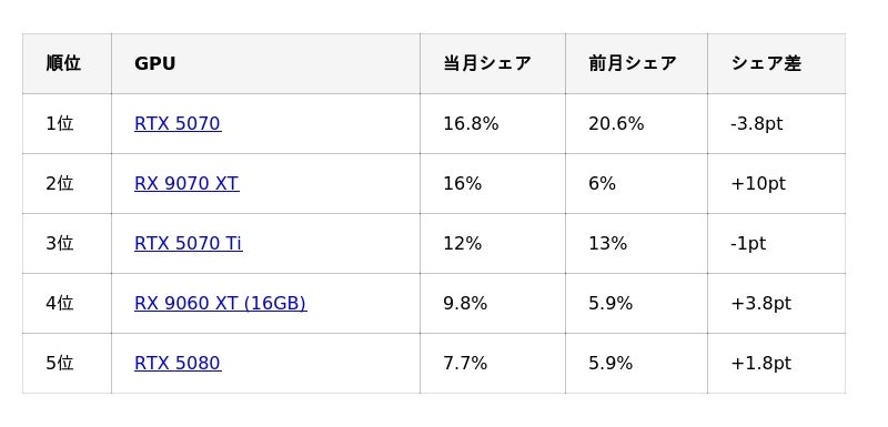 GPU別 市場動向 ― RTX 5070が首位維持、RX 9070 XTが急浮上 ―