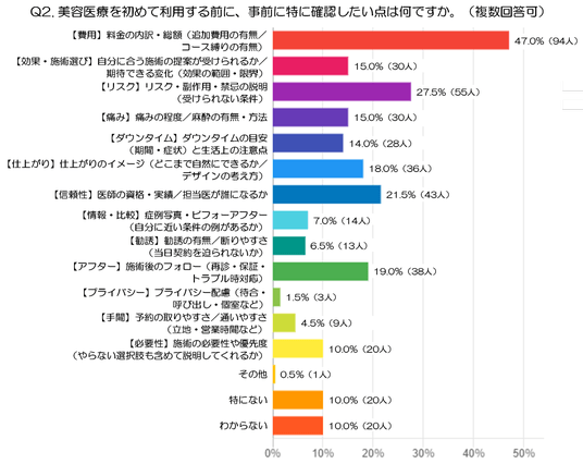 Q2.美容医療を初めて利用する前に、事前に特に確認したい点は何ですか。(複数選択可:注2)